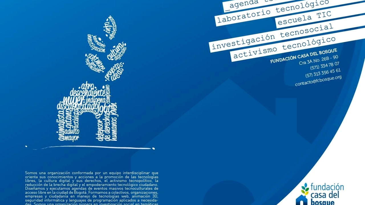 Fundación Casa del Bosque tiene infraestructura, tiene una casa, tiene servidores internacionales, tiene infraestructura para producción de contenidos, equipos cinematográficos para hacer campañas de comunicación pues es uno de nuestros énfasis. Otros son la promoción del software libre y la promoción del marketing político, y en el escenario del marketing político tenemos toda una infraestructura, un estudio de fotografía y grabación. Esos escenarios en medio de la pandemia se han seguido moviendo porque en última dentro de la pandemia también ha habido grandes luchas. En la medida de las grandes luchas generamos acciones con nuestros aliados que nos solicitan que les apoyemos en temas de comunicaciones.