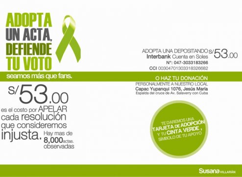 Ahora bien, miembros de Fuerza Social, el partido de Susana Villarán, han mencionado que no confían en la probidad de los funcionarios encargados de revisar las actas y emitir juicio sobre ellas, por lo que han adelantado que de serles los resultados desfavorables impugnarán las resoluciones de los JEE correspondientes. El pero, y aquí viene el quid del asunto, es que impugnar las actas tiene el costo de S/53.00 por cada una. Haciendo números nos encontramos con que impugnar las actas puede llegar a costar casi medio millón de soles. Es aquí donde surge la nueva y más reciente campaña Adopta una acta. De la información de la página en Facebook: