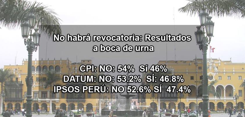 El primer resultado de la revocatoria del domingo con datos a boca de urna, daba una victoria, ajustada pero victoria, a los simpatizantes de la alcaldesa Susana Villarán. Sin embargo, luego empezaron a llegar de parte de las encuestadoras los primeros datos en la modalidad de conteo rápido, es decir los datos reales de las actas oficiales aún sin procesar. Y esto de alguna manera le aguó la fiesta a la gente del NO.