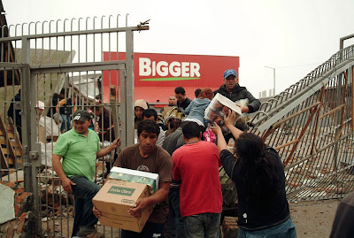 La foto al inicio del post muestra a individuos saqueando un supermercado en Concepción el 28 de febrero. Fue obtenida de una galería del Boston.com.
