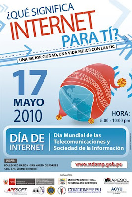 Hoy en Lima, como en muchas partes del mundo, se celebró el Día de Internet en diferentes sitios y de distintas maneras. La verdad, yo ni tiempo tuve para hacerle mucho caso, pero como me desocupé un poco a eso de las 5pm, aproveché que me quedaba cerca y a modo de estirar las piernas me dí un saltito a la cuadra 2 de la Av. Eduardo de Habich en San Martín de Porres, donde la Municipalidad de dicho distrito había organizado una pequeña exposición al respecto.
